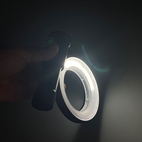 Pour allumer la bague LED, il suffit d’appuyer sur le bouton supérieur pendant une seconde. Pour l’éteindre, l’appui doit durer deux secondes. Une fois la lampe allumée, un simple appui sur le bouton permet d’accéder aux trois modes successifs que propose la bague en boucle sans fin: le mode lumière blanche en gradation synchrone gauche et droite, la lumière blanche en gradation gauche et droite séparée, et le mode lumière rouge.